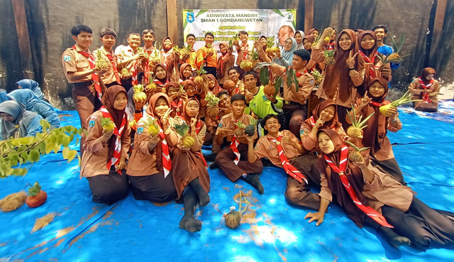 Gondangwetan – Adiwiyata SMAN 1 Gondangwetan mengadakan pelatihan kokedama di area School Food Care (SFC) SMAGONTA dengan mengundang pakar ahli dari Malang, Jumat, 3 Oktober 2025. Tujuan pelatihan kokedama tersebut untuk mempelajari dan mengembangkan keterampilan dalam membuat tanaman yang ditanam dalam potongan bola lumut yang kemudian digantung ataupun diletakkan dimeja. Pelatihan ini dapat membantu meningkatkan pengetahuan dan keterampilan dalam bidang hortikultura, dekorasi, dan kreativitas. Selain itu, pelatihan ini dapat menjadi sarana untuk meningkatkan inovasi serta menghasilkan karya seni yang indah dan bermanfaat. Acara diikuti oleh kader lingkungan SMAN 1 Gondangwetan sejumlah 35 murid, 33 murid perwakilan kelas, dan 30 orang pengurus Adiwiyata SMAN 1 Gondangwetan. Kegiatan digelar selama lima jam dengan penuh semangat dan antusias. Wawan Pramunadi, Kepala SMAN 1 Gondangwetan mengungkapkan jika pelatihan kokedama ini bukan hanya untuk mengembangkan pengetahuan dan keterampilan murid dalam seni tanaman tetapi juga untuk melatih kewirausahaan. “Sesuai dengan visi sekolah dibagian akhir yakni berjiwa wirausaha, sekolah mengupayakan kegiatan ini untuk melatih mental wirausaha dan berharap para kader yang mengikuti pelatihan hari ini dapat mempunyai gambaran tentang wirausaha dari kokedama ini,” paparnya. Pelatihan tersebut juga mendapat apresiasi dari pelatihnya. “Peserta pelatihan sangat semangat dan mereka berlatih dengan keinginan untuk bisa. Itulah yang saya harapkan. Kreatifitas dalam seni merangkai tanaman hias membutuhkan ketelatenan, ketelitian, dan kesabaran. Semoga bermanfaat,” ujar Heru Susilo Wardoyo, pakar ahli kokedama dari Malang.