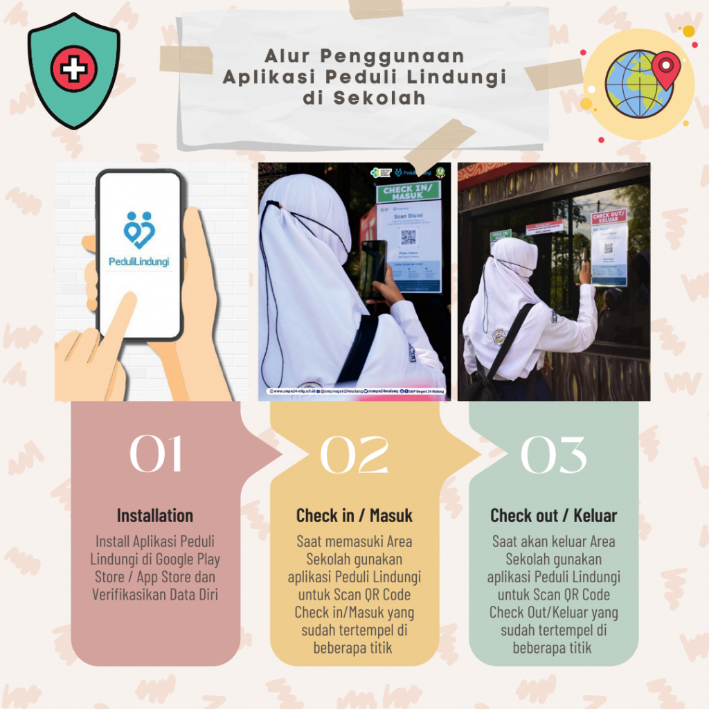 SMP Negeri 24 Malang di Masa Pandemi COVID-19 melakukan Pembelajaran Tatap Muka terbatas. Protokol Kesehatan yang ketat sangat menjadi perhatian dan diperhatikan. Para siswa selalu dihimbau untuk melakukan vaksinasi baik di dalam sekolah maupun di luar sekolah. Selain itu untuk lebih memudahkan tracing orang yang keluar/masuk area sekolah, SMP Negeri 24 Malang mendaftar ke Aplikasi Peduli Lindungi. Seluruh Warga Sekolah diwajibkan untuk Scan QR Code Peduli Lindungi menggunakan Smartphonenya masing-masing baik saat masuk ke sekolah maupun saat akan keluar sekolah. Berikut ini adalah alur penggunaan Aplikasi Peduli Lindungi di sekolah.